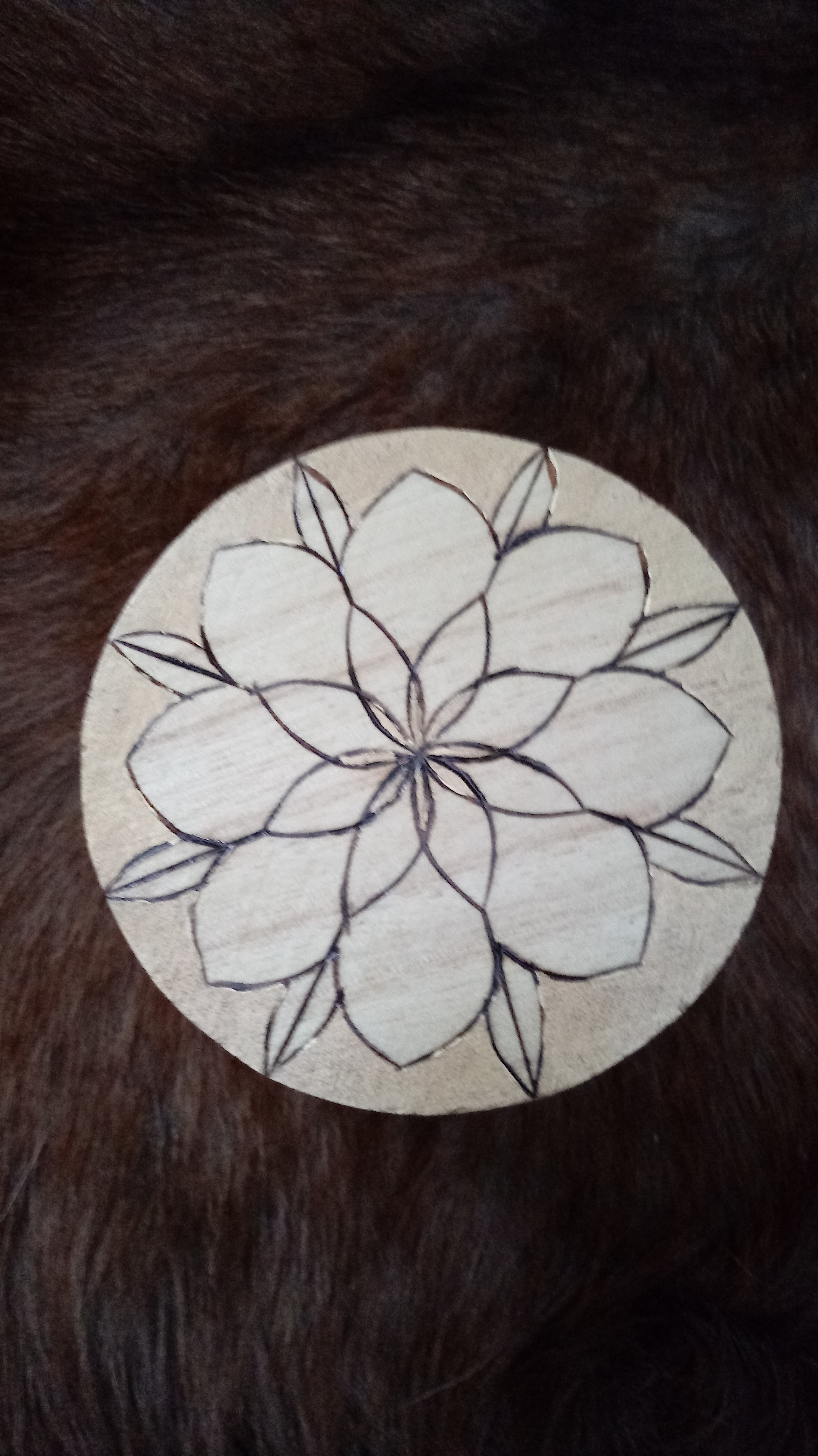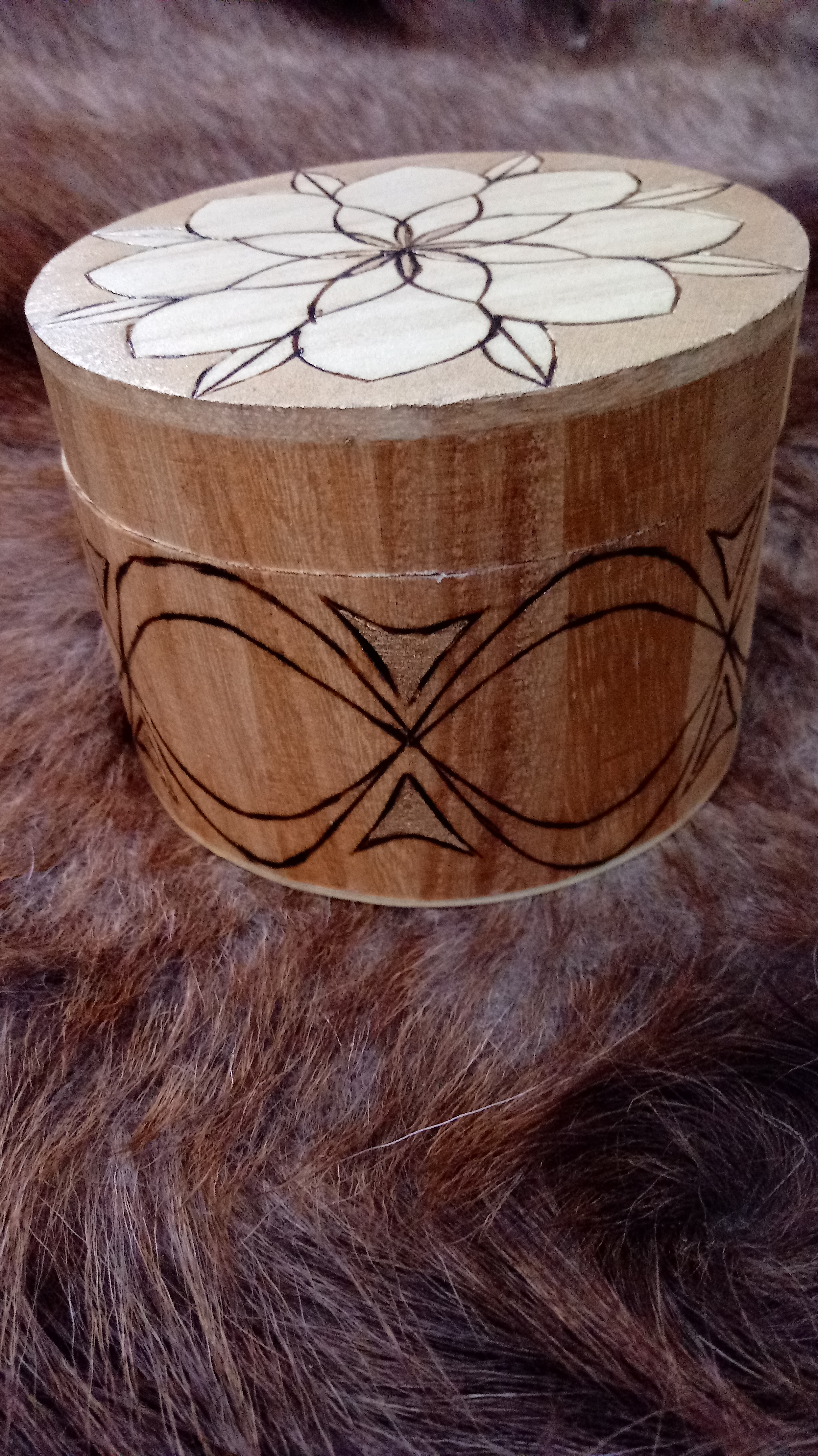 This is my personal favorite from this collection. This round box with a hidden magnetic closure measures 4 and 1/2 inches in diameter by just over 3 inches tall, (3 and 1/4 by 2 and 3/4 interior) and I have given it a white felt floor, a gold leaf painted inner lid, and quite a bit of decorative woodburning and gold leaf paint on the outside. The twisted ribbon with gold filled abstractions patter continues around the entire outside wall and the lid is similarly covered with gold leaf paint and a floral mandala inspired pattern. I’m really very happy with this box and it’s gotten numerous complements around the workshop. This box is $30