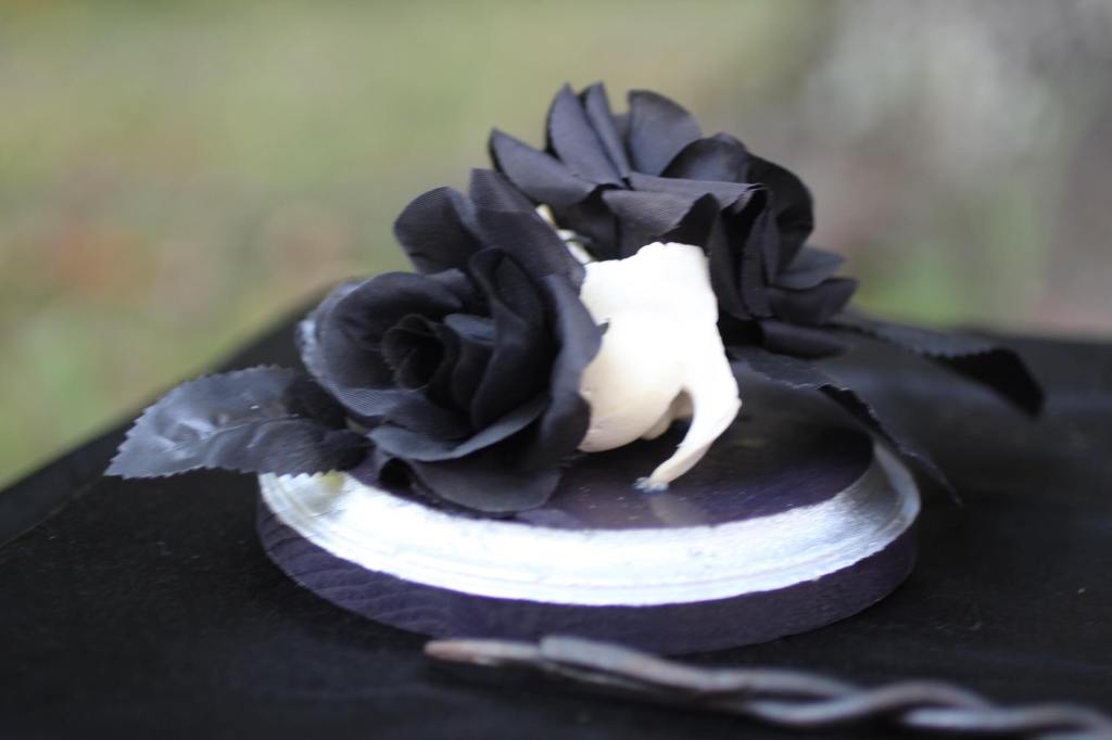 First up a brief walk in the garden of bones. On each hand painted wooden stand silk roses bloom eternally amid white bone. Both the duo of black roses and the single red rose rest in the axial vertebrae of a young buck goat- one of ours from our base farm. Bones have been cleaned, sanitized, and whitened with peroxide (never bleach as bleach damages the bones) and should remain bright for many years.