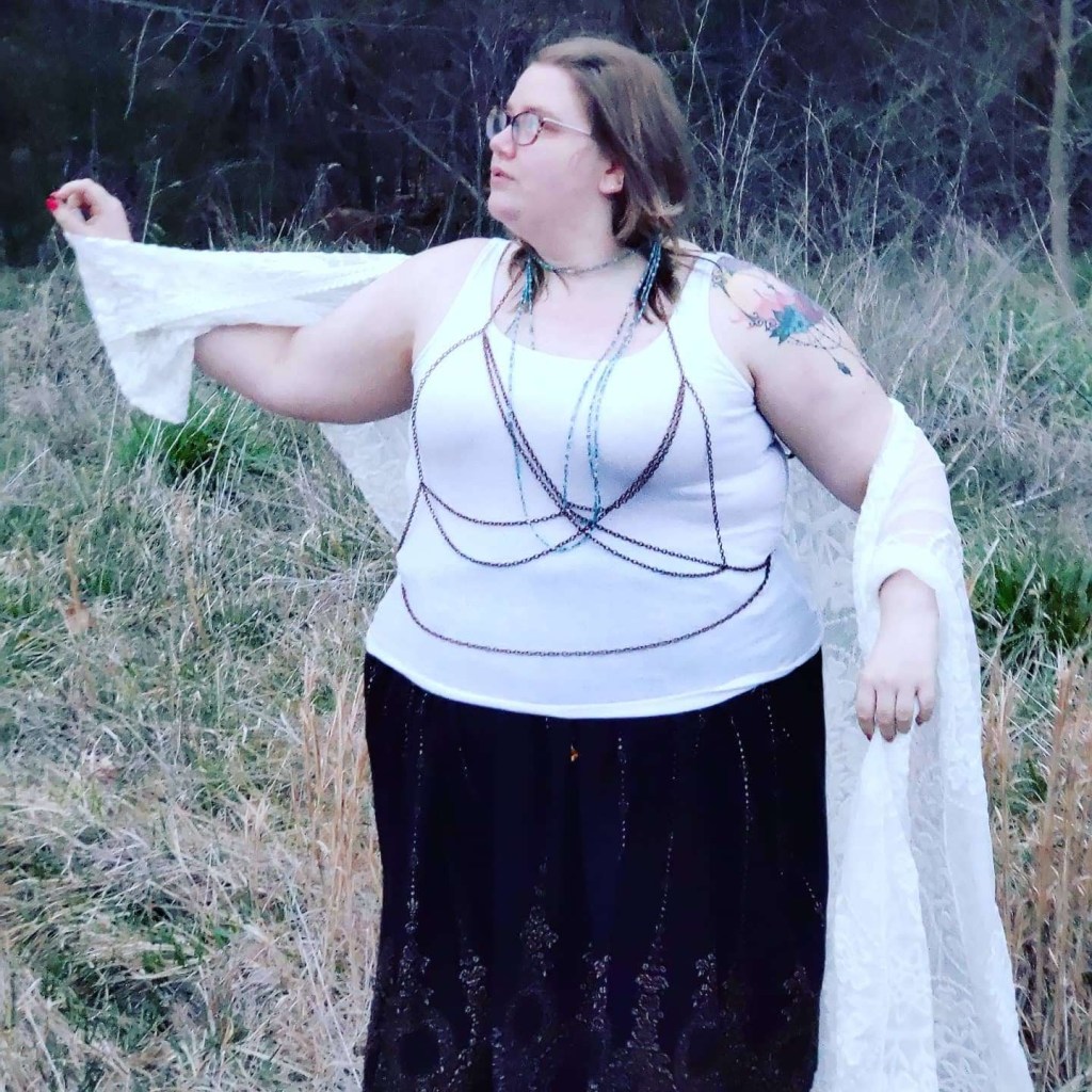 Goddess Beads from The Spider’s Masque are long strings of tiny glass beads in assorted complimentary colors, each string averaging approximately 9 feet. Wear them any way you like- multi strand necklaces, waist beads, looped around your arms, adorning your altar or staff, anywhere you wish. Our body chains are just that- elegant chain jewelry worn as you wish.