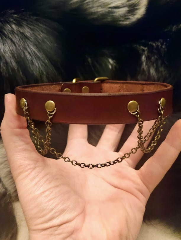 This choker, as with all similar items, is entirely hand crafted of US sourced leather. This choker is adjustable from a 14 to16 inch circumference.