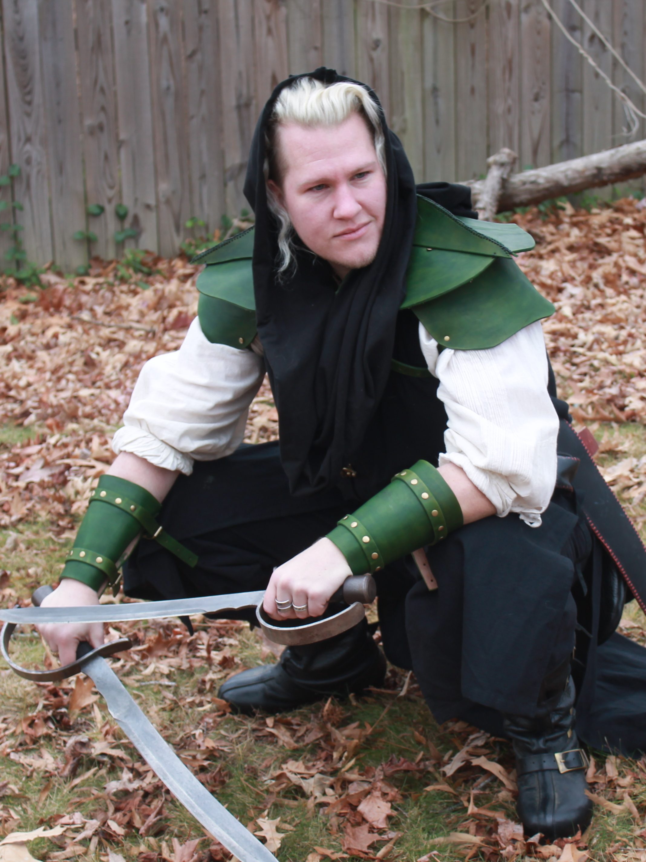 Entirely hand made out of US sourced leather- we’ve been over how important that is to me, right?- and dyed an absolutely stunning verdant green for your deep-woods adventuring fantasy fun. All hardware is antiqued brass. This set is designed to be worn alone over a cloth base, and relies on a chest and arm strap that is quite comfortable and permits an easy range of motion. This pattern also allows for a widely adjustable fit. The dyed-to-match bracers will comfortably fit up to a 9″ wrist.